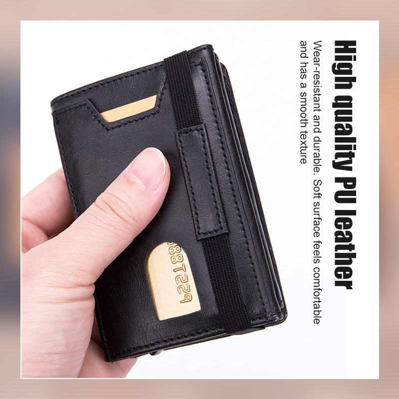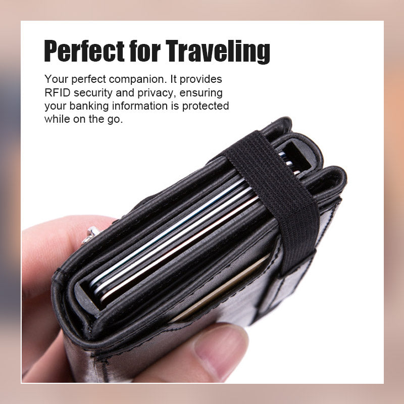 Oavsett om du reser i jobbet eller för nöjes skull är den här korthållaren din perfekta följeslagare. Den erbjuder RFID-säkerhet och integritet, vilket säkerställer att din bankinformation är skyddad när du är på språng.