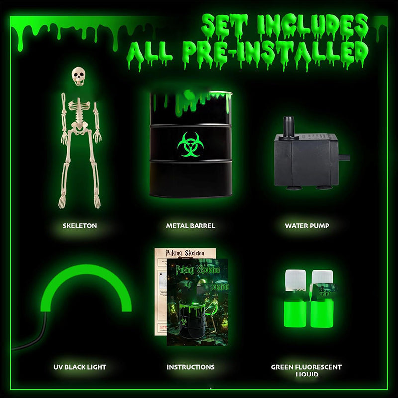 DIY FLOTTANDE POKION-SET - TRANSFORMERA ALLA RUM: Detta dekorativa set ger en kuslig atmosfÀr med en svart metallkittel, detaljerad skelettfigur och trolldrycksflaskor fyllda med fluorescerande vÀtska som lyser under UV-ljus. Den medföljande vattenpumpen cirkulerar vÀtskan och ger en flytande, glödande effekt, perfekt för Halloween eller andra dekorationer med spöklikt tema pÄ bordet, spiselkransen, verandan eller i trÀdgÄrden.